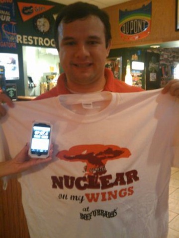 Will Strohl holding his new t-shirt, "I went Nuclear on my wings at Beef O'Brady's"