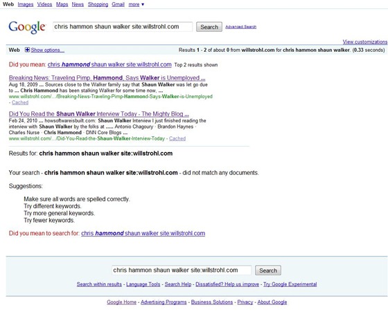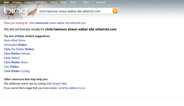 A while back, I wrote a tongue in cheek blog entry poking some fun at Chris Hammond and Shaun Walker.  It’s not really important to know who they are if you don’t already.  But in a niche .Net community, they are considered a pretty big deal.  I wanted to link to this blog post, so I searched for it on Bing, and a happy accident happened.  I misspelled Chris’s last name.  Bing had no idea how to handle this.