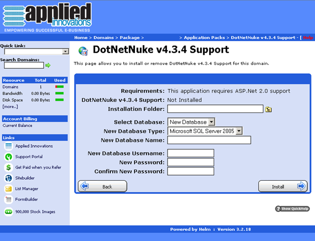 One of my first steps was to use one of their temporary URLs to install and stage my new DNN installation.  Through my investigation of my options in their control panel, I noticed two things to note for other DNN’ers.  First, the shared hosting account limits you to SQL Server 2005.  This is not a big deal, unless you’re a bleeding edge of technology kind of person, in which case you’d want 2008.  Second, their auto installer for DNN limits you to the latest 3.x release, and version 4.03.04.  For serious DNN’ers, this is hardly adequate, as we are currently at a stable DotNetNuke® version of 4.09.03 (about to be 4.09.04), and version 5.01.00 is right around the corner.