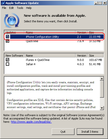 Apple Software Update: iPhone Configuration Utility highlighted