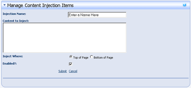 • Content to Inject: The HTML mark-up to add to the HTML source when the page is rendered.  This could be client-side scripts, or anything else you find to be necessary.
