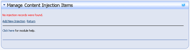 Adding something to be injected is simple.  If you have appropriate permissions, and the site is in Edit mode, click the "Manage this Module" link.  This will bring you to a view like shown in the next image.
