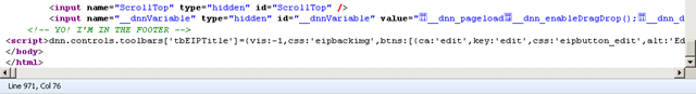 The footer injections are placed in the footer area of the HTML source, before the DNN scripts, but after the hidden form fields.
