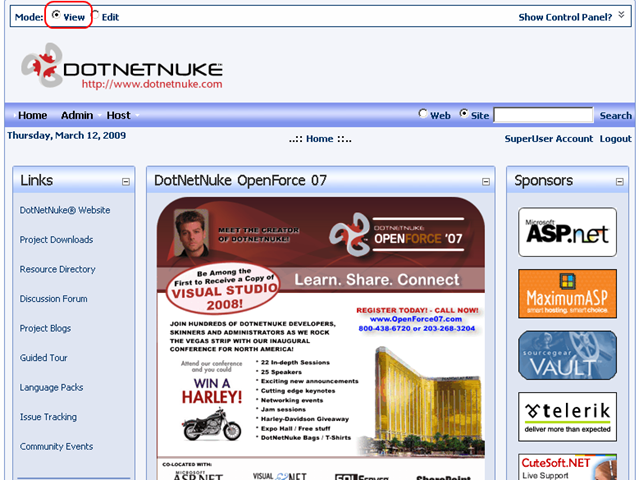One thing I wanted to do with this module, was to require as little manipulation from the administrator as possible.  I didn't want an administrator to have worry about how and where it might appear to unauthenticated site visitors.  So, I implemented a little trick to hide the module when the portal was not in "Edit Mode," resulting in a view like shown in the image below.  Note that you do not see the module anywhere, but it's there.
