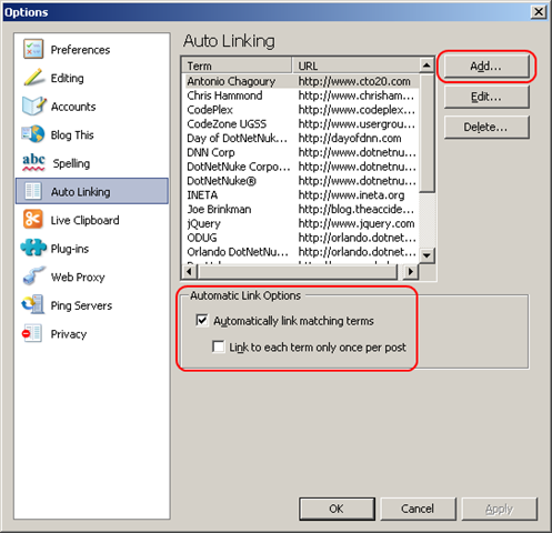 Windows Live Writer: Options > Auto Linking